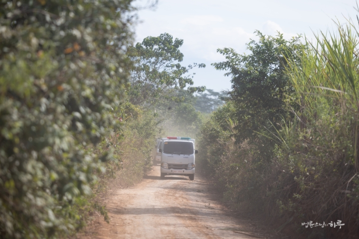 스님은 김홍신 작가님에게 운전석 옆자리를 양보한 후 트럭 뒷칸에 탑승했습니다. 열다섯 명이 옹기종기 앉은 채 탑승을 완료하자 트럭이 비포장 도로를 달리기 시작했습니다. 곳곳에 길이 파여서 덜컹거릴 때마다 손잡이를 꼭 잡았습니다. 좁은 길 양쪽으로 넓은 사탕수수 밭이 펼쳐졌습니다.