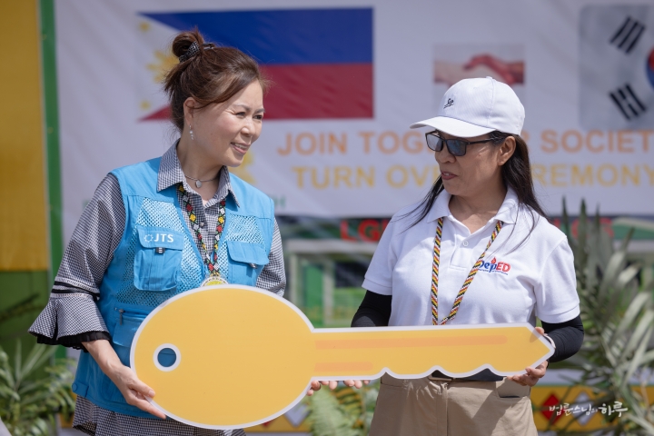 이어서 JTS 박지나 대표가 교육감에게 열쇠를 전달하고, 필리핀JTS 노재국 대표가 교장 선생님에게 교실마다 시계를 걸 수 있게 시계를 전달했습니다.