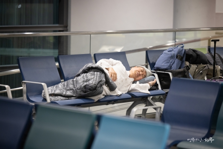 출국 수속을 마친 후 스님은 탑승구 앞에 누워 잠시 쉬었습니다. 일주일 전에 시작된 어깨 통증이 계속 낫고 있지 않아서 몸을 조금이라도 편하게 해 보았습니다.