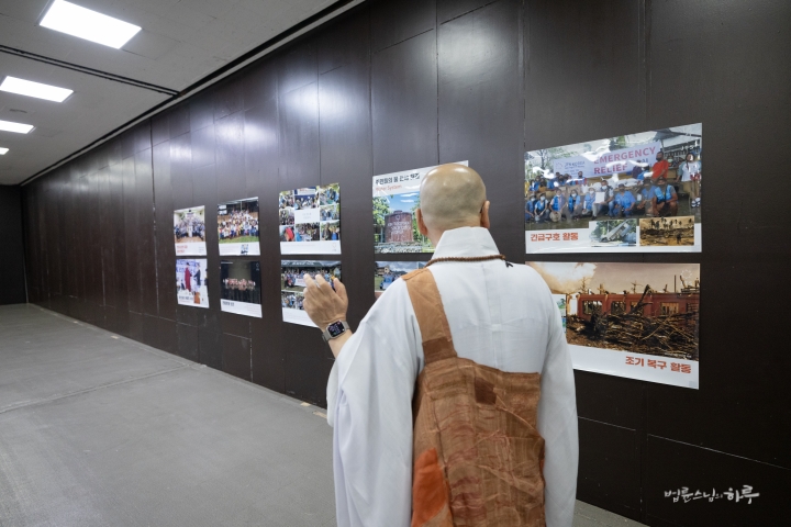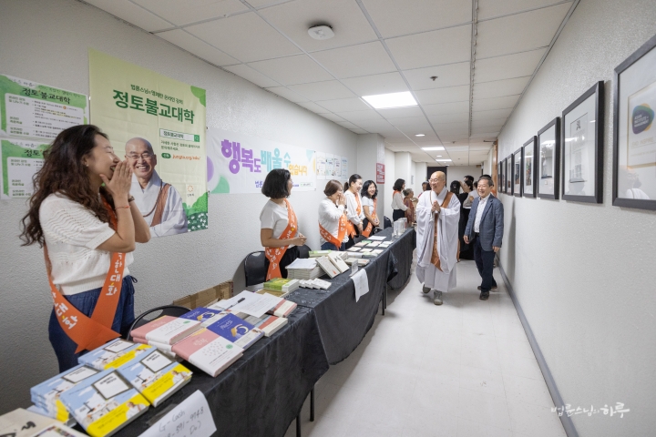 곳곳에서 봉사자들이 분주하게 강연 준비를 하고 있었습니다. 스님은 봉사자들과 반갑게 인사를 나눈 후 강연장으로 향했습니다.