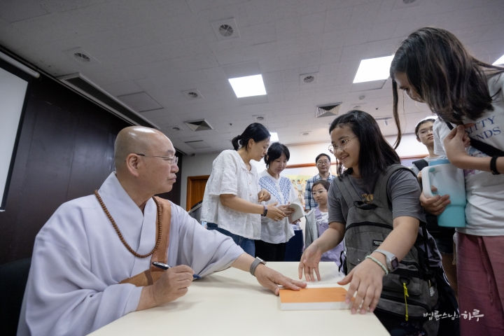강연이 끝나고 무대 위에서 책 사인회를 했습니다. 스님의 사인을 받기 위해 많은 분들이 길게 줄을 서서 차례를 기다렸습니다.
