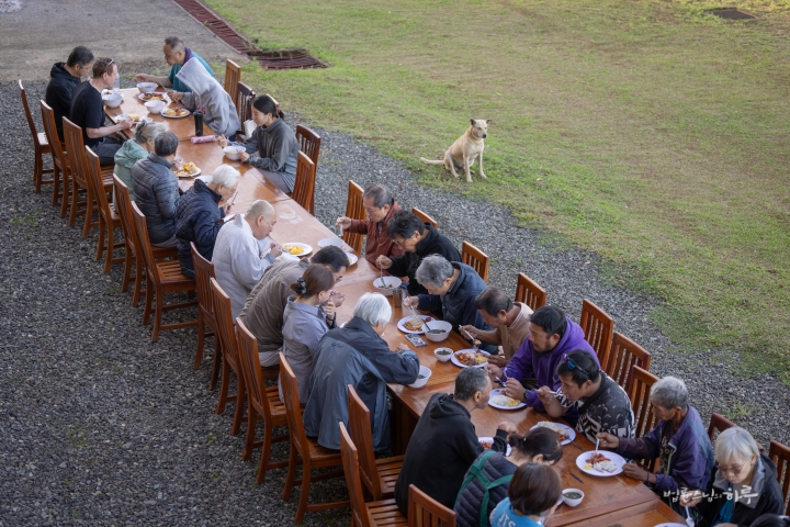 사진 촬영을 한 후 오전 6시부터 아침 식사를 했습니다. 날씨가 좋아 식탁을 야외로 옮겨, 모두 함께 아침을 나누었습니다.