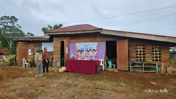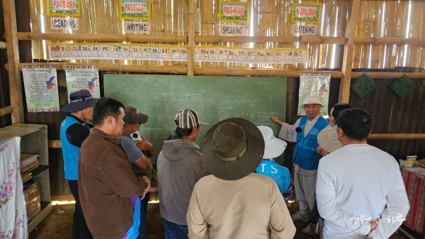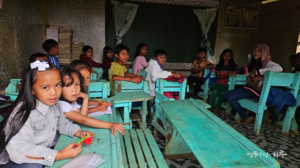 오전 7시 10분, 까아뚜안(Kaatuan) 원주민 학교에 도착했습니다. 나무판자로 지은 임시 학교에서 아이들이 공부하고 있었습니다.