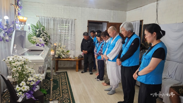 오후 4시에 미오의 집에 도착했습니다. 집 안에는 필리핀 전통 방식으로 장례를 치를 수 있게 꾸며져 있었습니다. 스님과 JTS활동가들은 조용히 해탈주를 염송했습니다.