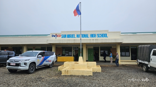 산미구엘(San Miguel) 국립고등학교는 2023년에 JTS가 지어준 학교입니다. 초등학교를 졸업한 여학생들이 고등학교에 진학하지 못해 미혼모가 되는 일이 잦아지자, JTS가 특별히 고등학교 건립을 지원했던 곳입니다. 11시에 도착해 보니 학생 수가 급증해서 일부 고학년은 학교 뒤편 임시 교실에서 수업을 하고 있었습니다.