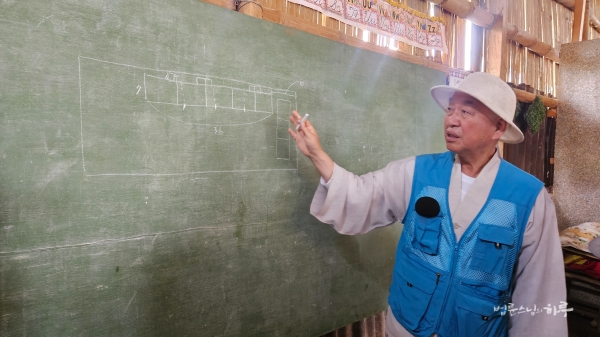 한참 논의 끝에 교실 뒤에 화장실을 붙이되, 공용으로 만들고 필요시 남녀를 구분해서 쓰기로 결론을 내렸습니다. 스님이 직접 줄자로 부지를 측정했습니다. 최종적으로 28미터(7m×4칸) 규모로 건물을 짓기로 결정했습니다.