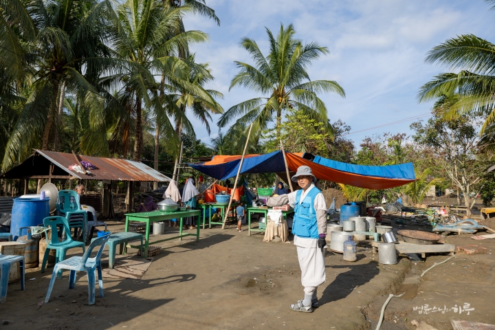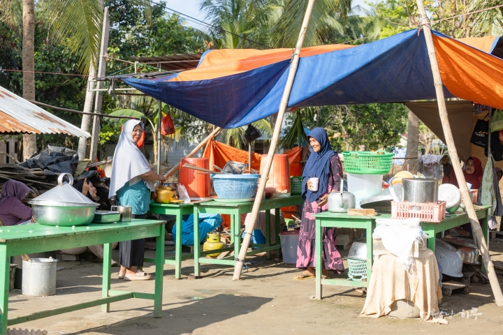 모스크 옆에는 마을 주민 700여 명이 공동 취사를 하고 있는 천막이 있었습니다. 여성들이 모여서 음식을 만들고 있었습니다. 흙이 가득 차 있는 집 안에서는 조리를 하지 못하니까 여기서 공동으로 밥을 하여 함께 끼니를 해결하고 있다고 합니다.