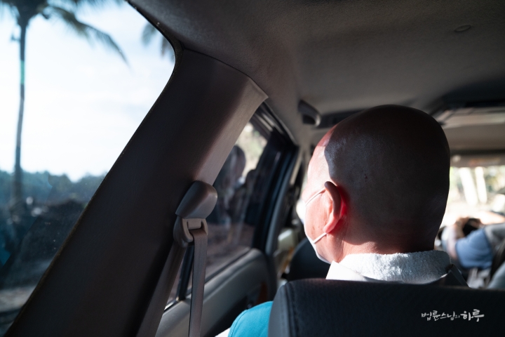 스님은 새벽 수행과 명상을 마친 후 숙소에서 오전 7시에 아침 식사를 했습니다. 박지나 JTS 대표님과 오늘 구호품 배분 계획에 대해 의논한 후 8시에 마을로 향했습니다.