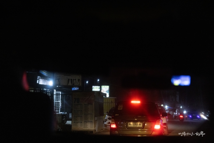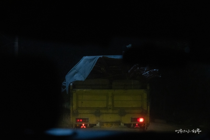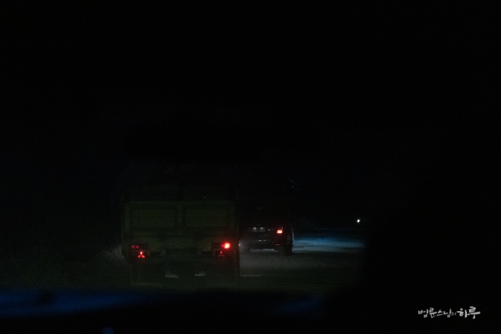 기도를 마치고 다시 가던 길을 갔습니다. 해가 완전히 저물자 고불고불한 비포장 도로와 포장도로가 번갈아가며 계속 산 쪽으로 나아갔습니다.