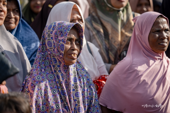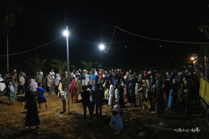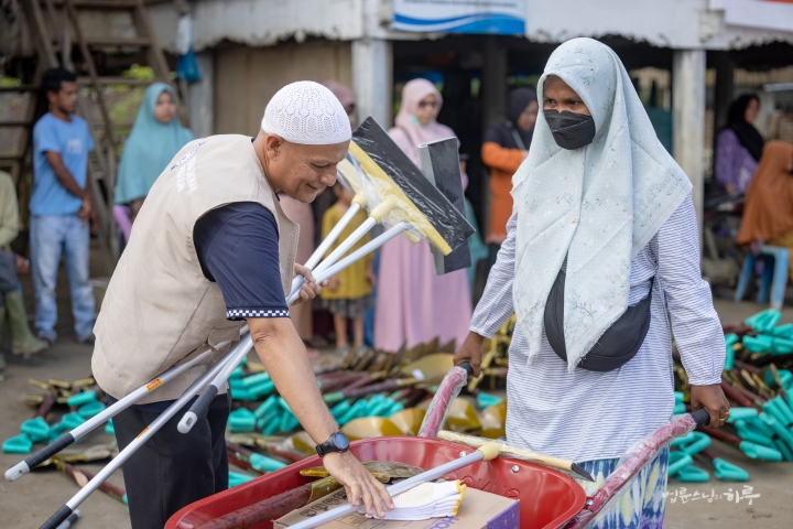 지금 여러분이 처한 상황은 매우 어렵습니다. 그러나 여러분이 믿는 알라신께서 여러분을 버리지 않고 보호하실 것이라는 믿음을 갖고 이 어려움을 잘 극복해 나갔으면 좋겠습니다. 지원하는 물건들이 비록 작지만 여러분 모두가 유용하게 써주셨으면 합니다. 특히 어제 밤늦게까지 손수레를 조립해 준 남자분들을 위해 감사의 박수를 보내 주십시오.”