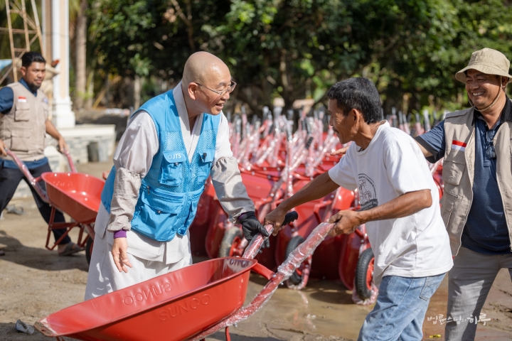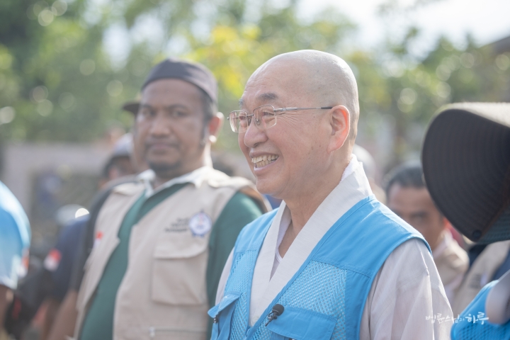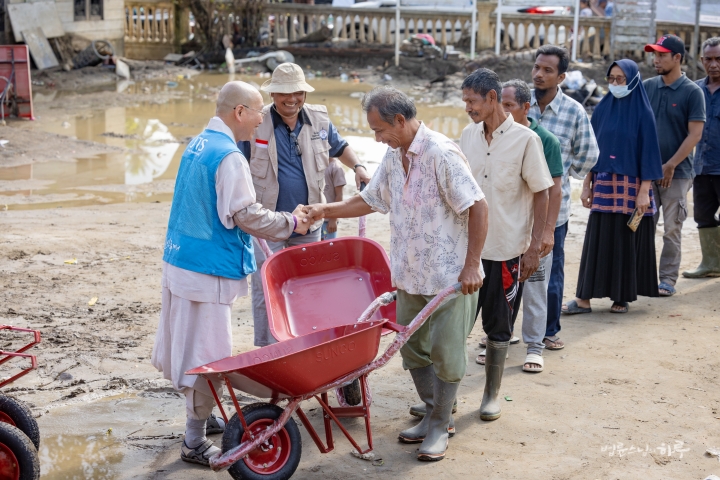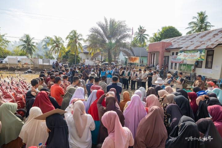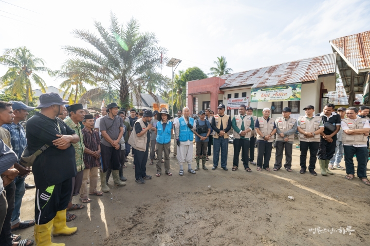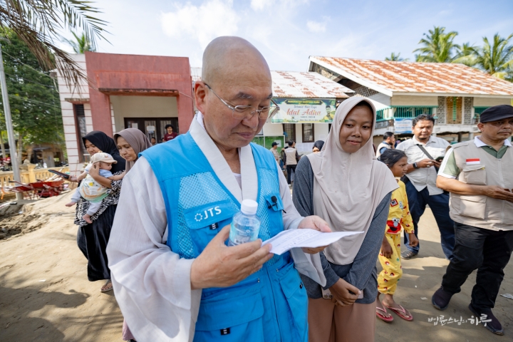 “법륜스님께, 존경하는 스님. 안녕하십니까. 저희는 이번 홍수로 큰 어려움을 겪고 있는 아체 꾸부 마을의 주민들입니다. 갑작스러운 재난으로 모든 것이 막막하고 마음이 무거웠던 차에, 스님께서 먼 길을 마다하지 않고 저희 마을을 직접 찾아주신 것에 깊은 감동을 받았습니다. 스님의 따뜻한 미소와 전해주신 도움의 손길은 저희에게 다시 일어설 수 있다는 큰 희망이 되었습니다.