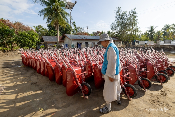어제 마을 주민들은 밤늦게까지 손수레를 조립했다고 합니다. 스님이 도착하자 200개의 손수레가 가지런하게 정렬되어 아침 햇살에 반짝이고 있었습니다. 감동이었습니다.