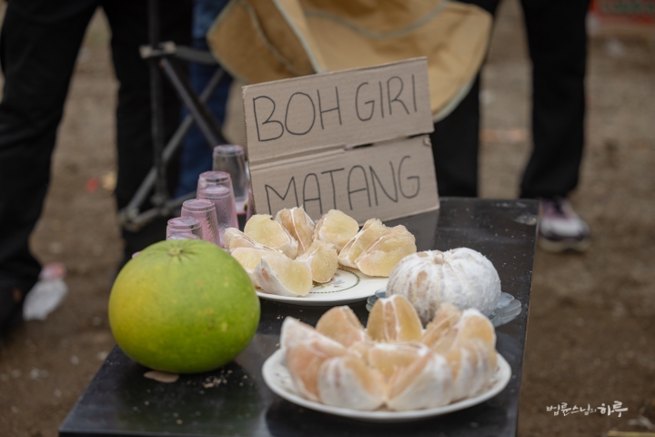 배분을 마치고 스님이 땀을 닦자 마을 청년이 과일을 정성껏 가져와서 건넸습니다. 과일 이름이 ‘보기리 마탕’이라고 합니다. 이 지역에서 자라는 과일이라고 소개했습니다.