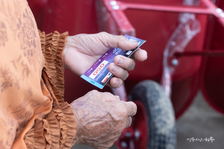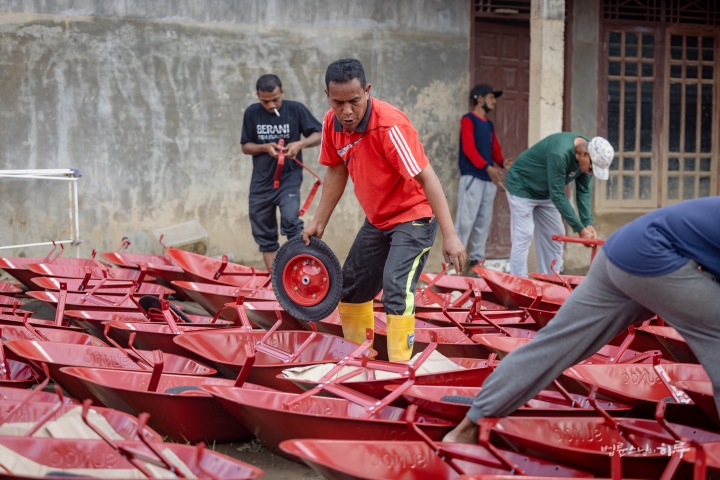 이어서 스퀴즈, 장갑, 삽, 괭이를 차례대로 나누어 주었습니다. 손수레에 담긴 청소도구만큼 주민들의 마음도 희망으로 가득 찼습니다.