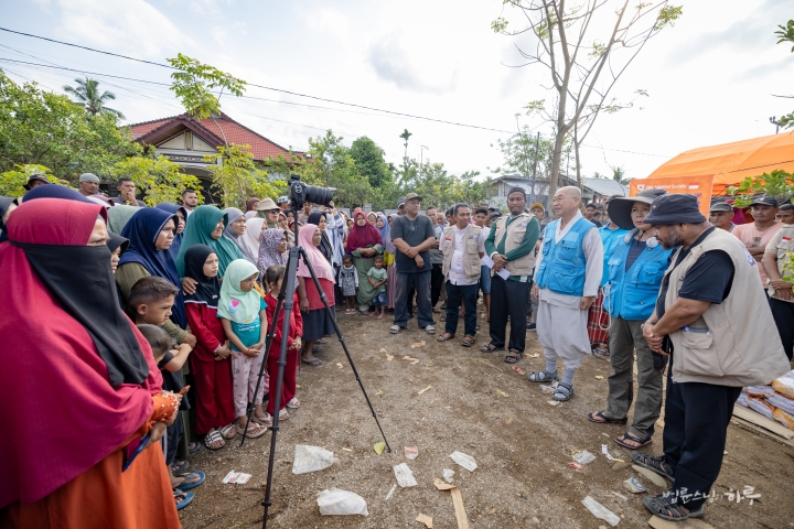 물품을 하나씩 점검하는 사이 주민들이 모두 모스크에 모였습니다. 스님은 JTS가 이곳에 구호품을 갖고 온 과정에 대해 설명한 후 조금이라도 피해 복구에 도움이 되었으면 하는 바람을 이야기했습니다.