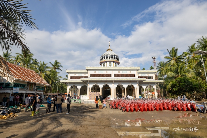 차로 한 시간을 이동하여 오전 9시에 꾸부 마을에 도착했습니다. 구호품을 받기 위해 모스크에 마을 주민들이 하나둘씩 모이고 있었습니다.
