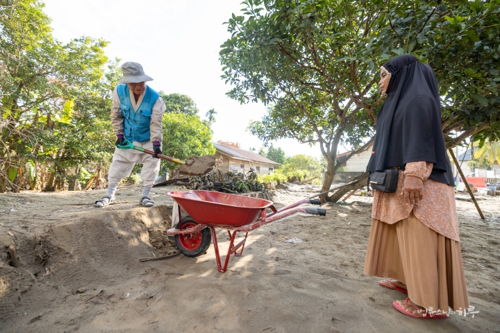 “손수레도 잘 굴러가네요. 집 안에 흙이 가득 차 있기 때문에 이렇게 삽으로 흙을 퍼서 손수레에 담아 집밖으로 퍼내는 겁니다. 마을 주민들이 이게 가장 필요하다고 했어요.”