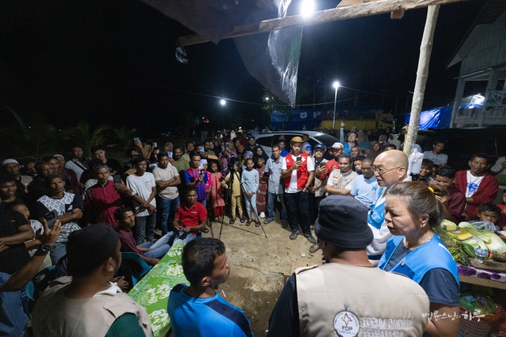 “여러분들이 수해 피해를 입어서 조금이라도 도움을 주고자 이곳을 찾아왔습니다. 원래는 오늘 오후에 구호품을 나눠주고자 했는데, 길이 막혀서 물품을 실은 트럭이 늦게 도착하는 바람에 이렇게 밤늦게 여러분을 만나게 되었습니다.