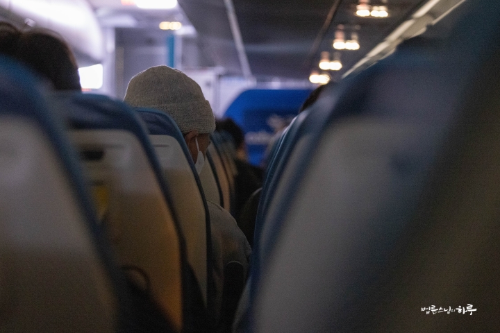비행기는 직항으로 9시간 동안 하늘을 날았습니다. 비행기 안에서 스님은 향후 1년 간 진행될 해외 일정을 점검했습니다.