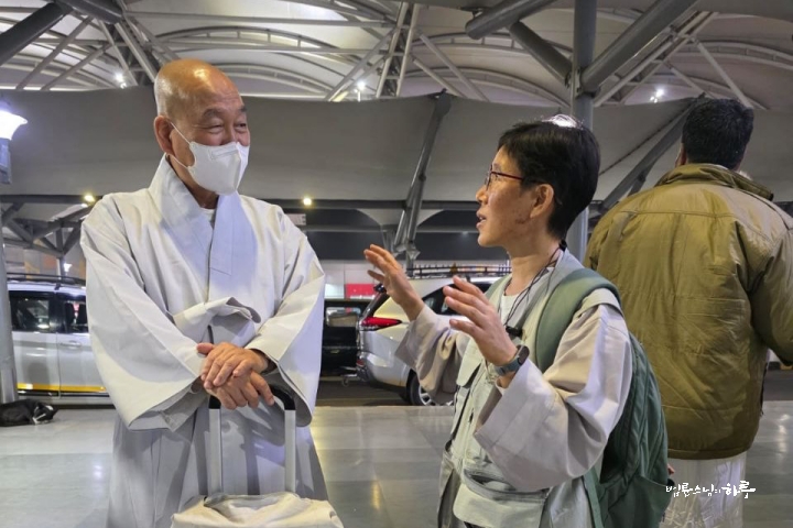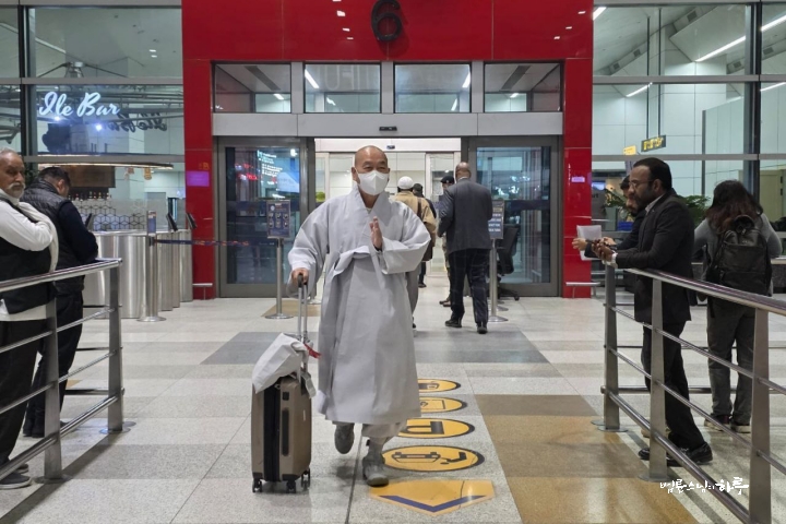 현지 시각으로 오후 5시 30분에 비행기가 델리 공항에 착륙했습니다. 인도 입국 수속을 마치고 스님이 순례객 중 제일 먼저 공항을 나왔습니다.