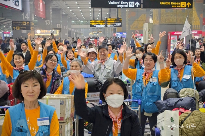 인도 성지 순례 참가자들은 모두 질서 정연하면서도 밝은 모습으로 공항에서 나왔습니다. 수자타아카데미에 지원할 물품을 포함하여 100개 상자를 버스에 가지런히 싣고 저녁 8시에 바라나시를 향해 출발했습니다.