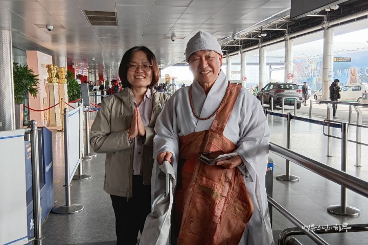 공항에 도착해 탑승 수속을 밟은 후 비행기 탑승 전까지 스님은 잠시 휴식을 취했습니다.