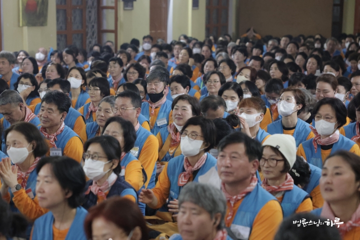 이어서 제35차 성지 순례 입재 법문을 시작했습니다. 좁은 공간이라 대중은 앉아서 청법가를 부르고, 삼배로 법을 청했습니다.