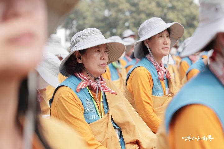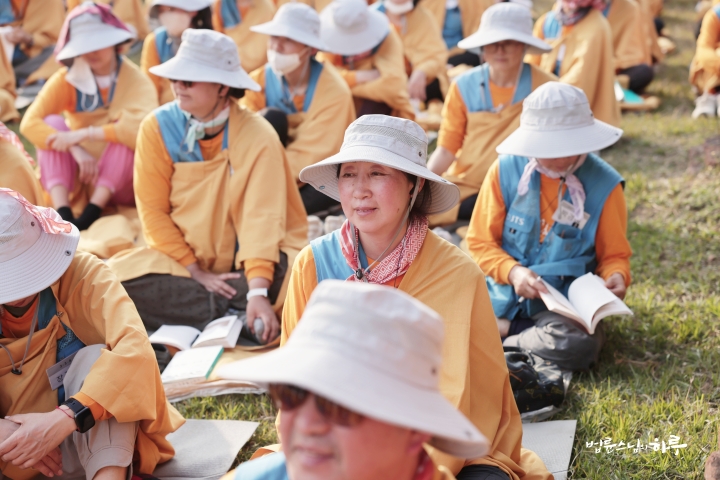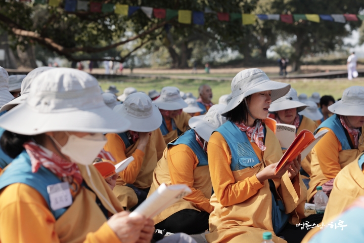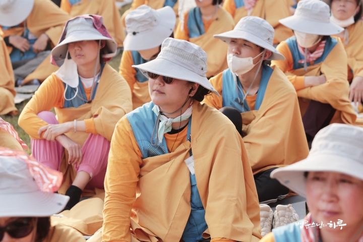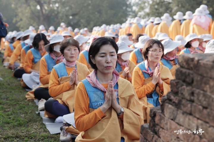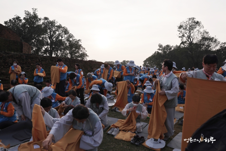 순례단은 입구에서 가사를 수하고 탑을 한바퀴 돈 후 자리에 앉았습니다.
