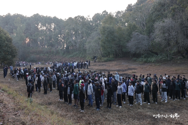 순례단은 스님을 따라 산속으로 들어갔습니다. 오르막이 나타날 때마다 잠시 멈춰 설산이 잘 보이는 지점을 알려주기도 했습니다. 얼마 후 넓은 공터에 도착했습니다. 사람들의 기합 소리가 들려왔습니다. 가까이 가보니 청년 수백 명이 군사 훈련을 하고 있었습니다.