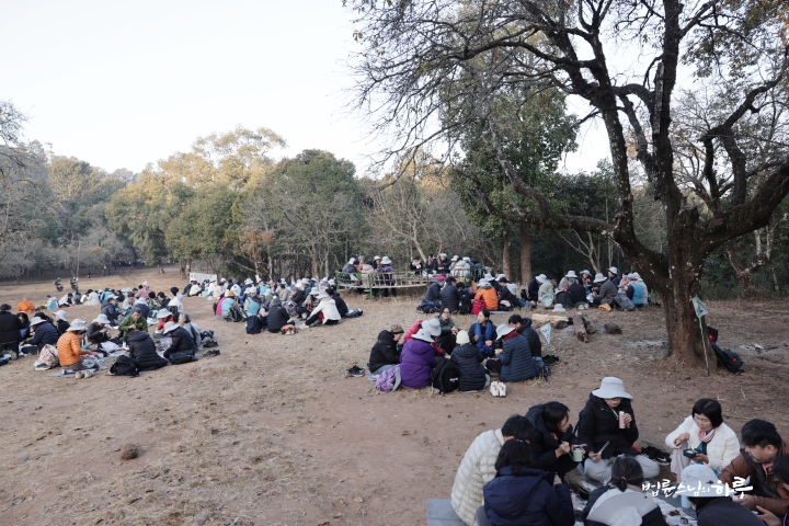 다시 자리를 옮겨 다른 공터로 갔습니다. 대중이 모두 모이자 공양게송을 하고, 각자가 준비한 도시락으로 아침 공양을 했습니다.