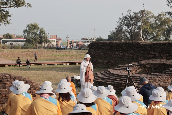 순례단은 부처님의 태자 시절 궁터 옆에 자리를 잡았습니다. 스님은 부처님이 되기 이전, 한 인간 싯다르타가 타인의 고통을 자신의 문제로 받아들이며 출가를 결심하게 된 과정을 이야기했습니다.