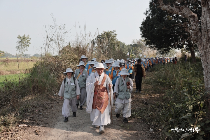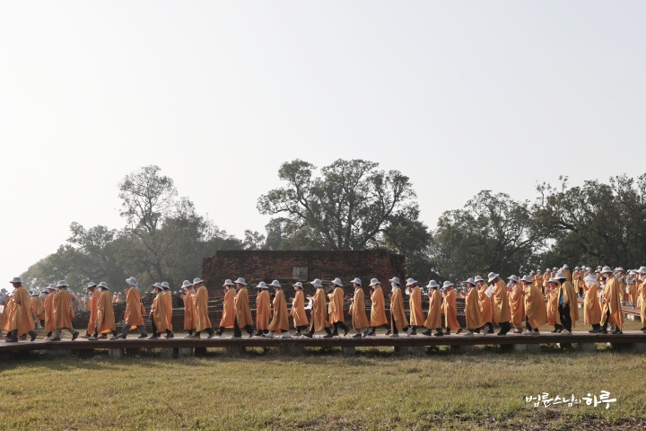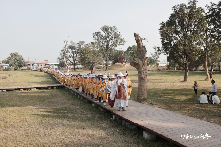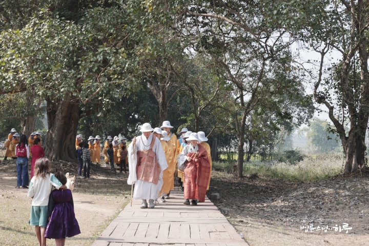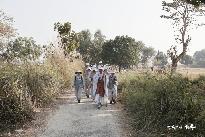 "이제 우리도 저 동문으로 나가 북쪽 문 밖 수행자를 만난 탑을 지나 쿠단으로 가겠습니다. 가는 길은 논길입니다. 한 줄로 천천히 걸으며 인도 농촌의 풍경도 함께 느껴보세요. 유채꽃이 만발해 있을 겁니다.“