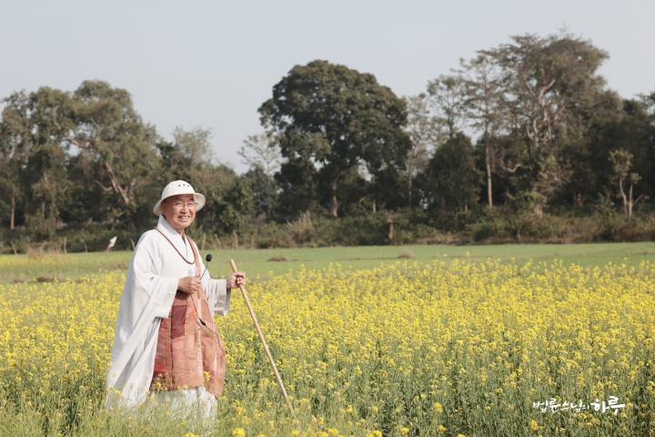 들에는 보리의 초록빛과 유채의 노란빛이 어우러져 가득하게 펼쳐져 있었습니다. 스님은 길을 내어주고 안내해 준 마을 사람들에게 감사 인사를 하며 선물을 드렸습니다.