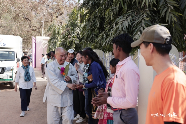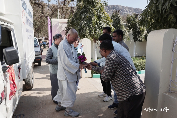 인도인 스태프들이 학교에 핀 꽃으로 만든 소박한 꽃다발을 건네자, 스님은 환한 미소를 지으며 꽃다발을 받아 들었습니다. 스님은 스태프들과 악수를 하며 반가운 마음을 나누었습니다.