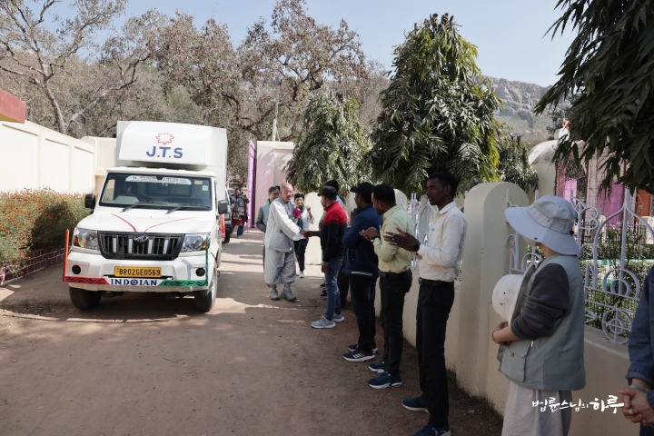 오후 1시 40분, 눈에 익은 전정각산이 병풍처럼 펼쳐지고 저 멀리 수자타아카데미가 보였습니다. 수자타아카데미에 도착해 차에서 내리니 입구에는 인도 JTS 스태프들과 상주 대중이 스님을 기다리고 있었습니다.