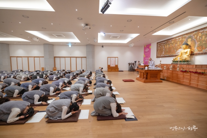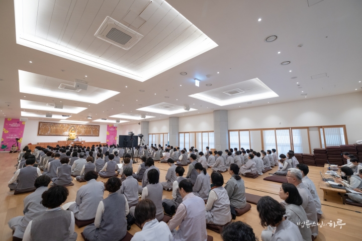 회의를 마치고 스님은 발심행자 수계식을 하기 위해 3층 설법전으로 향했습니다. 설법전에는 120여 명의 수계자들이 자리해 있었습니다. 10여 명의 해외지부 수계자들은 온라인으로 참석했습니다.
