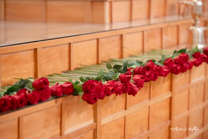 모든 수계자들이 수계첩을 받고 자리에 앉자 스님은 전법회원에 대해 설명해주었습니다. 수계 대중은 감사의 마음을 담아 스님에게 꽃을 선물하고, 바른 길로 인도해 준 것에 대해 삼배를 올렸습니다.