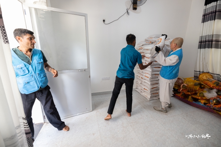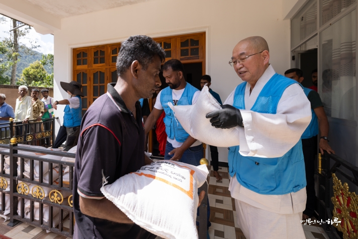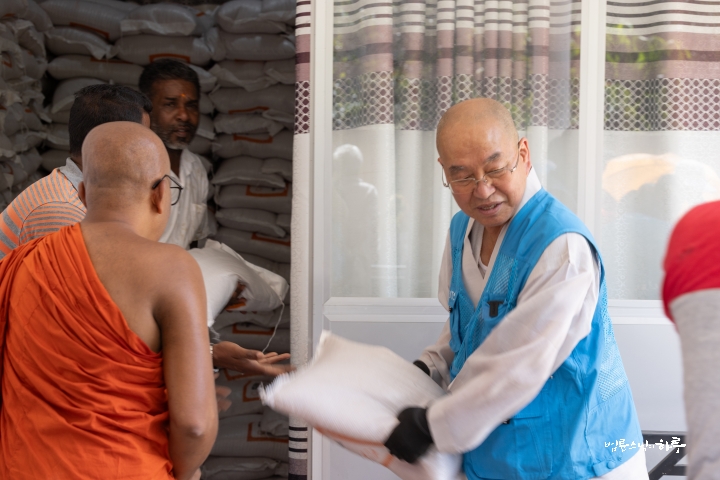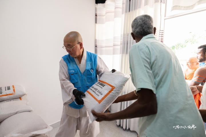 잠시 후 스님은 쌀 포대를 건네는 일을 다른 사람에게 넘겨주고, 쌀을 나르는 일을 도왔습니다.