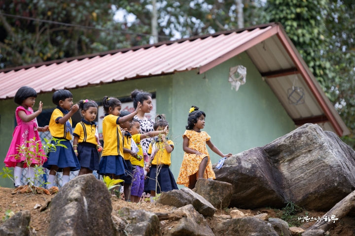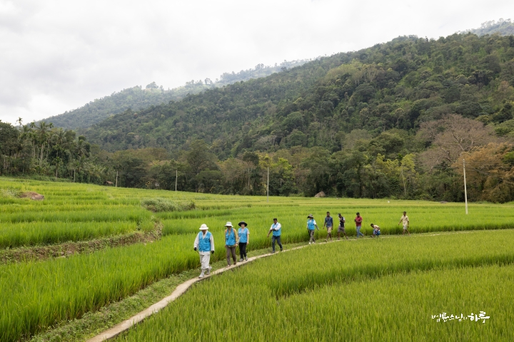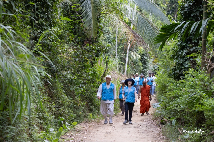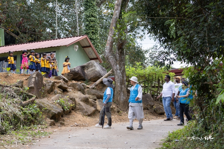 산길을 4시간 넘게 달려 오전 10시 45분, 오늘 구호 물품 배분을 진행할 파싸라 지역의 사찰에 도착했습니다. 이 마을에 태풍으로 끊어진 다리를 보수해달라는 요청이 있어서 배분 전에 직접 가보기로 했습니다. 큰 차량으로 갈 수 없어 차에서 내려 걷기 시작했습니다. 유치원 아이들이 달려 나와 스님 일행에게 인사를 했습니다.