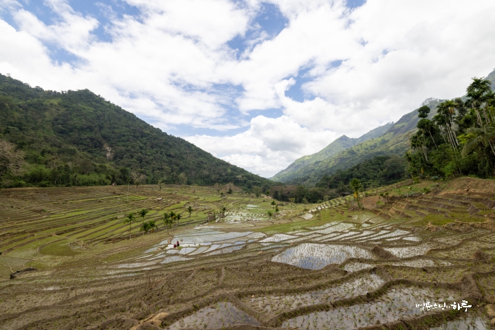 야트막한 오르막을 오르자, 갑자기 시야가 열렸습니다. 울창한 산속에 다랑논들이 층층이 펼쳐져 있었습니다.