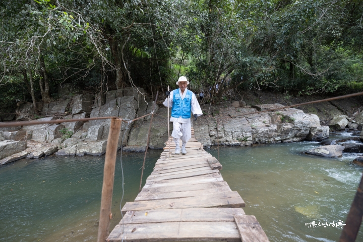 스님은 임시로 만든 다리를 살피고는 가장 먼저 건넜습니다.