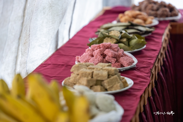 오전 11시, 논을 지나 마을 주민의 집으로 갔습니다. 마을 사람들이 다과를 차려놓고 기다리고 있었습니다. 손으로 빚은 스리랑카 전통 음식들이었습니다.