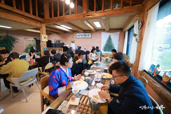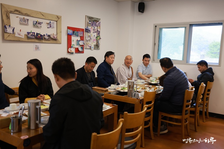 스님은 새벽 정진과 명상을 하고 오전 7시 30분에 부탄 방문객들과 숙소 앞에서 만나서 아침 식사를 하러 마을 카페 ‘초록이둥지’로 이동했습니다.