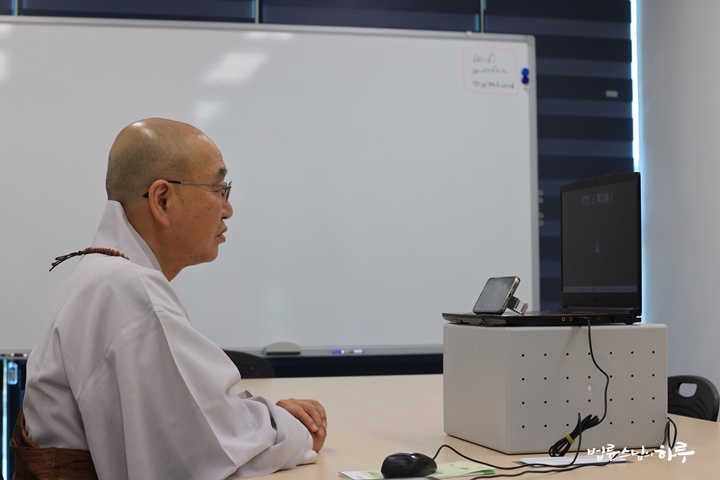 강의가 진행되고 있는 공간의 다른 별도 공간을 잠시 빌려서 급하게 노트북을 설치하고 스님이 온라인으로 법회에 참여할 수 있도록 오디오 테스트와 화면 높이 조절하는 사전 준비를 했습니다. 10시 4분에 스님은 노트북 앞에 앉았습니다. 주간 정토행자 소식을 영상으로 본 후에, 청법가와 삼배로 스님께 법문을 청했습니다. 스님은 현재 근황과 오늘 보게 될 영상에 대해 설명해 주었습니다. 많은 회원들의 후원금으로 손길이 필요한 아체 지역의 수해민들에게 생활용품인 주방용품과 청소용품을 잘 배분하고 왔고, 소중하게 후원금이 잘 쓰였다는 부분에서 자세하게 알려주었습니다.