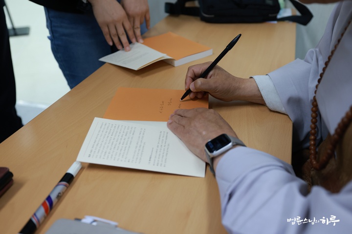 온라인 접속이 끝나자, 스님은 바로 강의실로 다시 돌아와서 진행되고 있는 프로그램에 참여했습니다. 잠깐 휴식 시간이 주어졌고, 그 짧은 시간에도 스님은 군수님과 부탄 방문객들을 서로 소개해 주고, 직원들과도 인사를 나누고 책을 준비해 온 직원들에게 직접 사인도 해주었습니다.