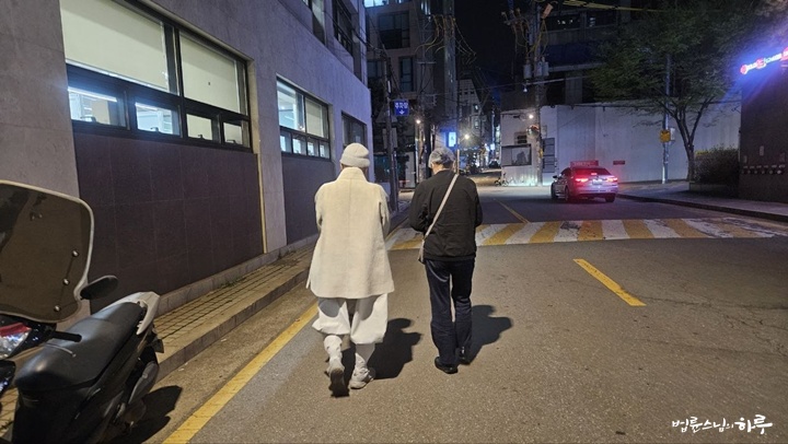 짐을 찾고 인천 공항을 나와 서초동 정토회관으로 가는 길은 퇴근 시간에 맞물려서 차가 밀렸습니다. 스님은 차 안에서 쉬지 않고 업무를 보았습니다. 오후 5시가 넘어서 회관에 도착하였고, 스님은 짐을 풀고, 저녁 식사를 했습니다.