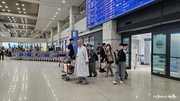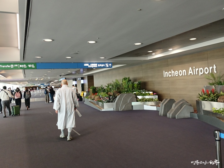 긴 비행 끝에 스님은 한국 시각으로 오후 3시 30분에 인천 공항에 도착했습니다.