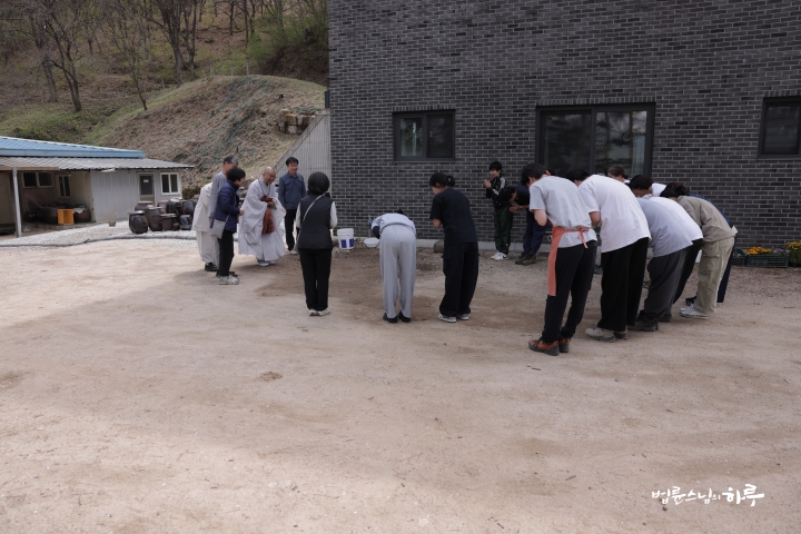 자행 노스님의 처소가 있는 마당에 들어서자, 마침 수련원에서 울력을 하던 백일출가 행자들이 일제히 내려와 스님께 인사를 드렸습니다.