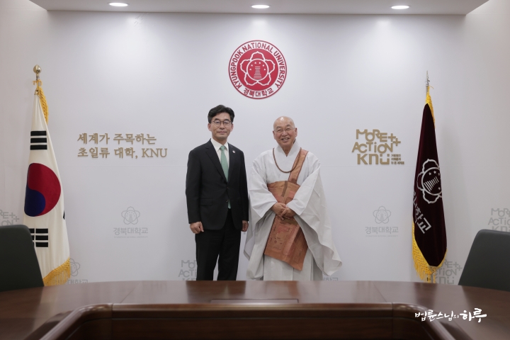 스님은 총장실로 이동하여 총장님과 차담을 나누었습니다. 올해는 경북대학교 80주년이 되는 해입니다. 개교 80주년을 기념해서 대강당에서 스님의 즉문즉설이 열리게 되었습니다. 총장님은 스님에게 학교에서 이런 강연을 해주는 것에 감사 인사를 하였고, 스님도 총장님에게 대강당을 사용하도록 배려해 주신 것에 대해 인사했습니다. 오후 7시가 되어 스님은 차담을 마무리하고 강연장으로 이동했습니다.
