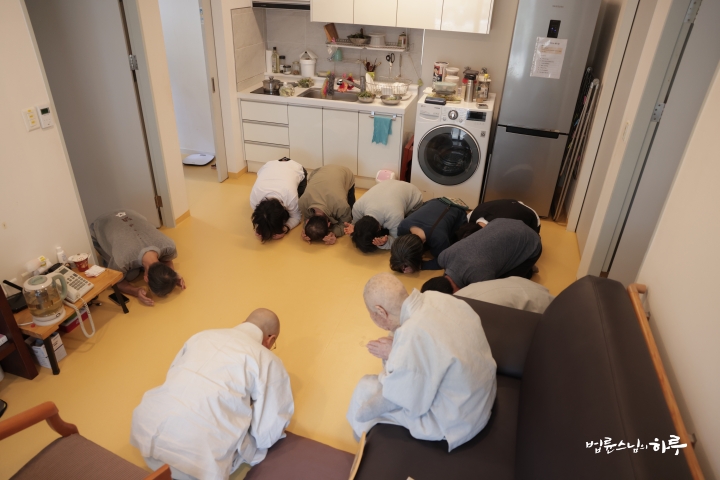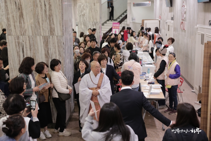 스님은 접수를 기다리는 사람들, 봉사하는 사람들 한 명 한 명에게 인사를 하고 대기실로 이동했습니다.